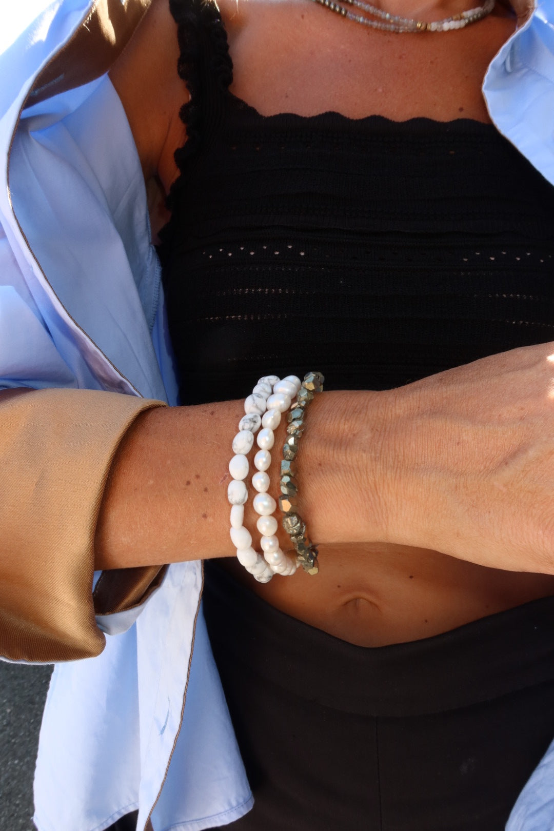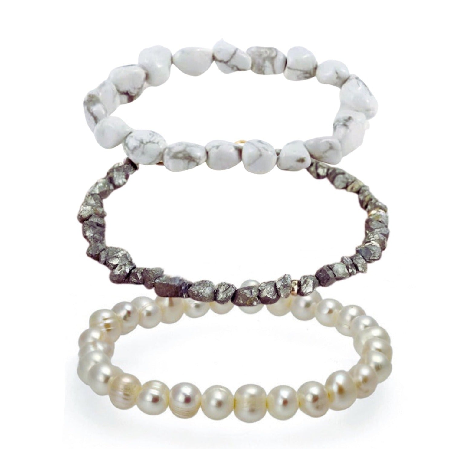Magnesit, Pyrit & Pearl Bracelet Trio gives you the ultimate power to protect yourself from: